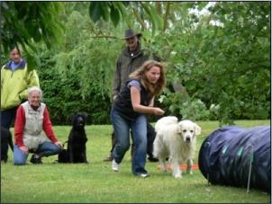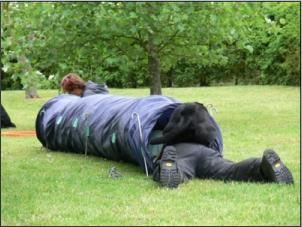 Den Abschluss bildete ein Wettlauf von Hund und Mensch durch einen Tunnel und zurück. Das gefiel den mitgereisten Kindern am
