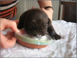 Seit 3 Tagen füttern wir Welpenmilch zu. Die Welpen laufen munter durch die Kiste und wir können erste