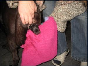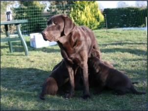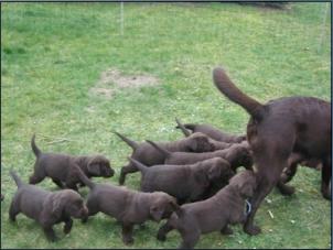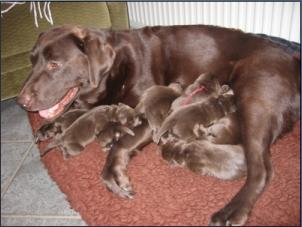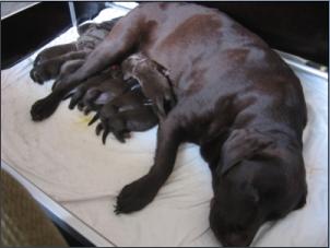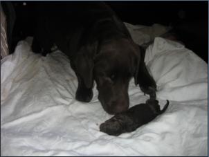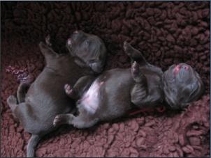 Gestern abend ging das Hecheln erneut los. Billa wollte immer wieder nach draußen zum Pullern, hatte "Klecker-Durchfall", wühlte alle Decken und Laken durcheinander und versuchte, in jedes Loch zu verschwinden, das sie unter unseren Hecken im Laufe der Jahre gebuddelt hatte. Das Frühstück erbrach sie und da gestern die Temperatur heruntergegangen war, rechnete ich heute mit dem Geburtsbeginn, 4 Tage vor dem geplanten Wurftermin. Mittags war es dann soweit. Billa wollte immer wieder hinaus und plötzlich guckte ein kleines Beinchen aus der Vulva. Wieder in der Wurfkiste passierte gar nichts, so daß ich nach 15 Minuten noch einmal mit ihr hinausging und dann draußen hockte sie sich sofort hin und preßte das erste kleine Mädchen in unseren Vorgarten (Handtuch war natürlich bei der Hand). Wir sausten dann schnell hinein und in der Wurfkiste wurde die Kleine "ausgepackt" und abgenabelt, natürlich von Billa. Es war allerdings relativ schwierig, den ersten Welpen zu begutachten und zu wiegen, Billa sprang an mir hoch und wollte ihn sofort wiederhaben. Ca. im Stundentakt wiederholten wir das Ganze dann zehnmal, Billa bekam alle ihre Welpen im Vorgarten und versorgte sie vorbildlich in der Wurfkiste. Um Mitternacht trat endlich Ruhe ein und Billa schlief etwas.