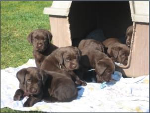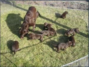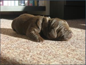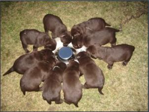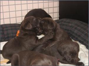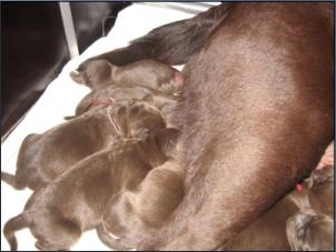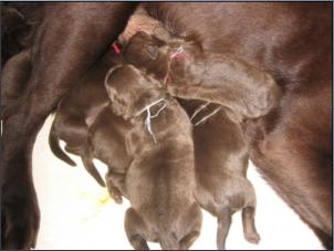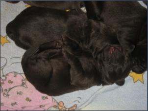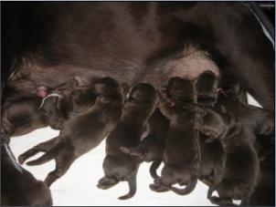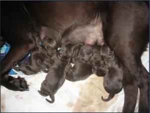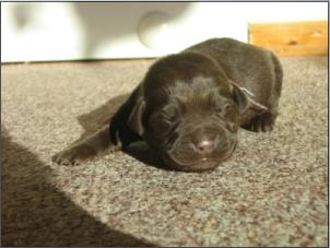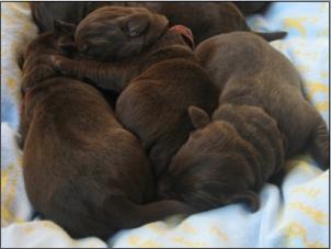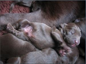 Alle haben schön zugenommen, ein Teil der Welpen wiegt schon über 500g. Die Nabelschnüre sind abgefallen, die kleine Öhrchen hängen heute fast alle und die Welpen ähneln nun schon einem Labrador.