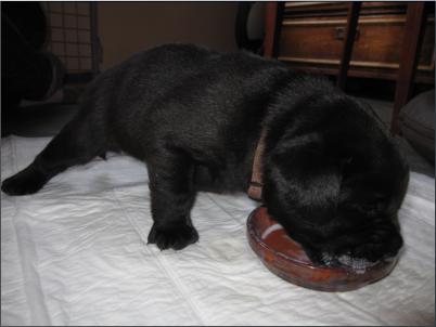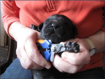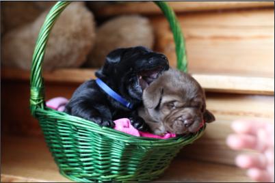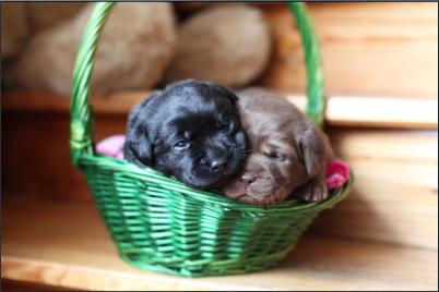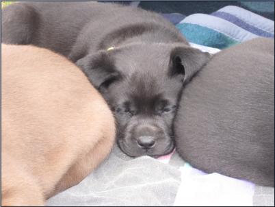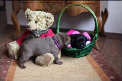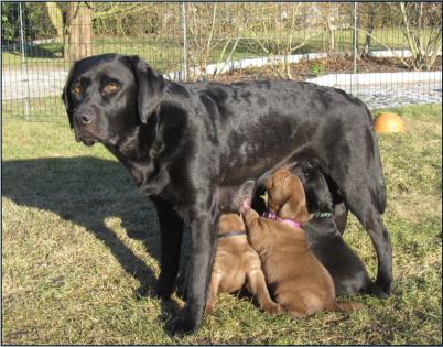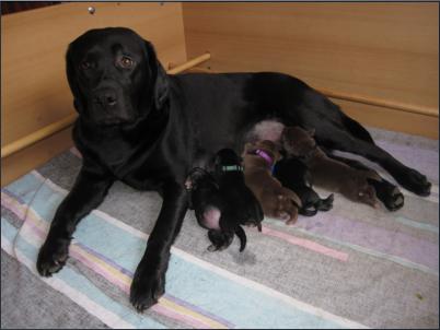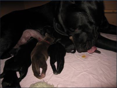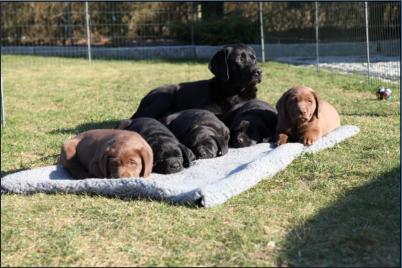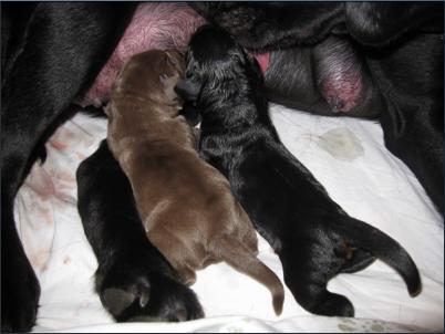 Der B-Wurf ist gefallen! Allerdings ist nicht allzuviel zu berichten, denn völlig unkompliziert brachte Momo die Welpen zur Welt. Wenn man nicht genau hinsah, bekam man erst etwas mit, wenn sie die Kleinen perfekt abnabelte und trocken und sauber leckte. Um 5:00 Uhr in der Früh fiel ein braunes Mädchen, dann ein schwarzer Rüde, es folgte ein schwarzes Mädchen. Leider wurde der Mix nicht komplettiert mit einem braunen Rüden, aber bis 9:45 Uhr erblickten dann noch ein zweites braunes Mädchen und ein zweiter schwarzer Rüde das Licht der Welt. Alle waren sehr mobil und stürzten sich auf die Milchbar. Der Tierarzt kam mittags, besah sich alle und war zufrieden.